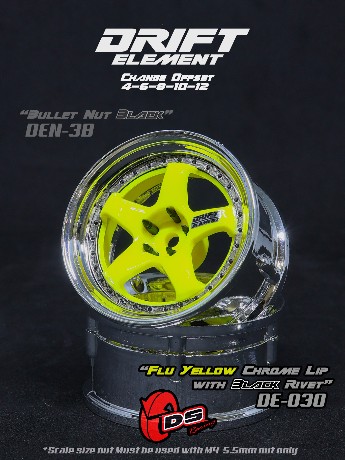 DS Racing / DE-030 / Drift Element 5 Spoke Wheel Adj. Offset (2pcs) / Flu Yellow Face / Chrome Lip with Black Rivets