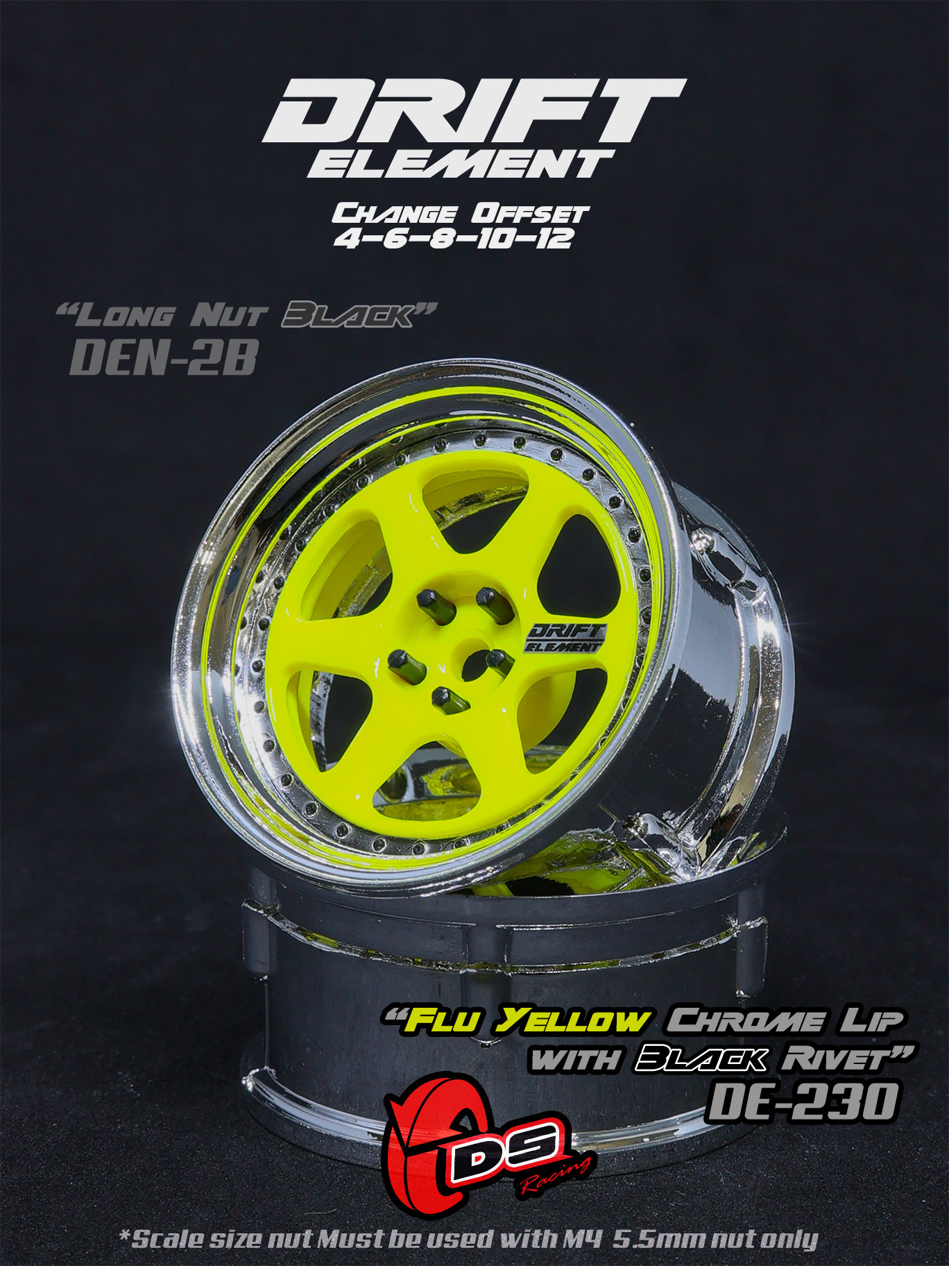DS Racing / DE-230 / Drift Element 6 Spoke Wheel Adj. Offset (2pcs) / Flu Yellow Face / Chrome Lip with Black Rivets