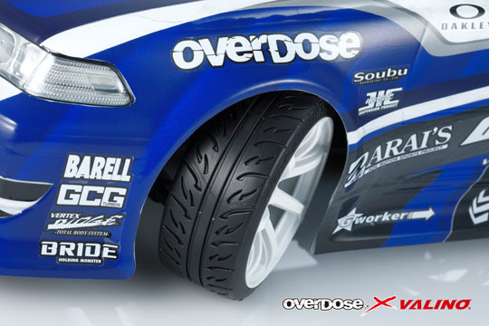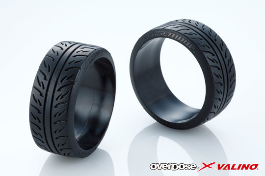 OVERDOSE x VALINO collaboration tires and wheels are finally available. Completely reproduce sidewall shape, outer diameter, roundness of the tread surface, and the groove depth of the VALINO PERGEA 08RS tire design. The tire material is HDPE with emphasizes grip compound, available with 26mm and 30mm tire width. The tire traction and controllability balanced at a high level are necessary to create RC drift scene. Also available VALINO GV330 design wheels. Using R-Spec material for high traction. Available with 26mm and 30mm wheel width. Come with 2 pcs of each both tires and wheels.