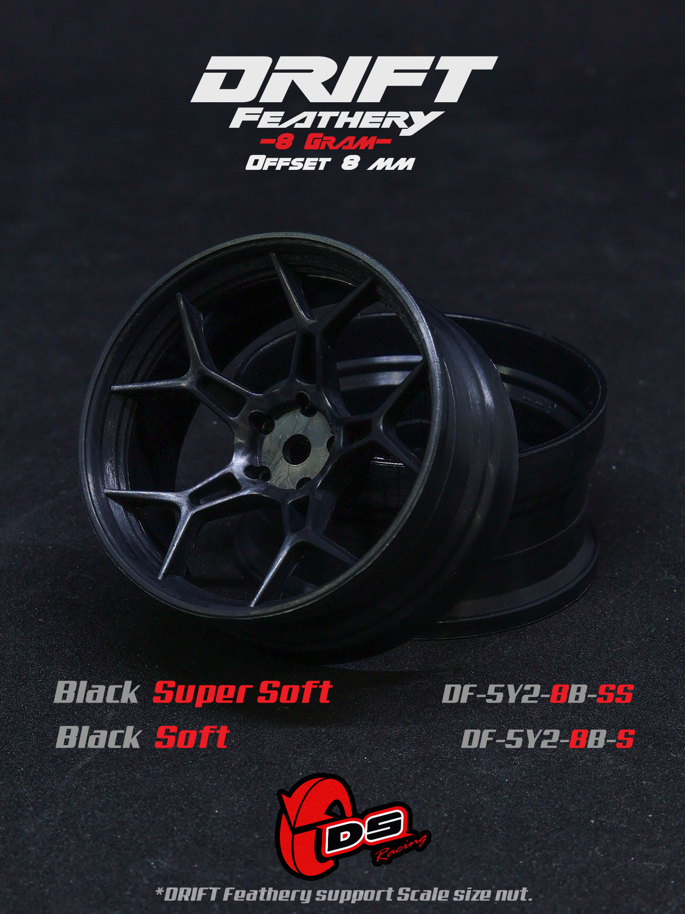 DS Racing / DF-5Y2-8B-SS / Drift Feathery 5Y Spoke Wheel (2pcs) / Black Super Soft / +8mm offset