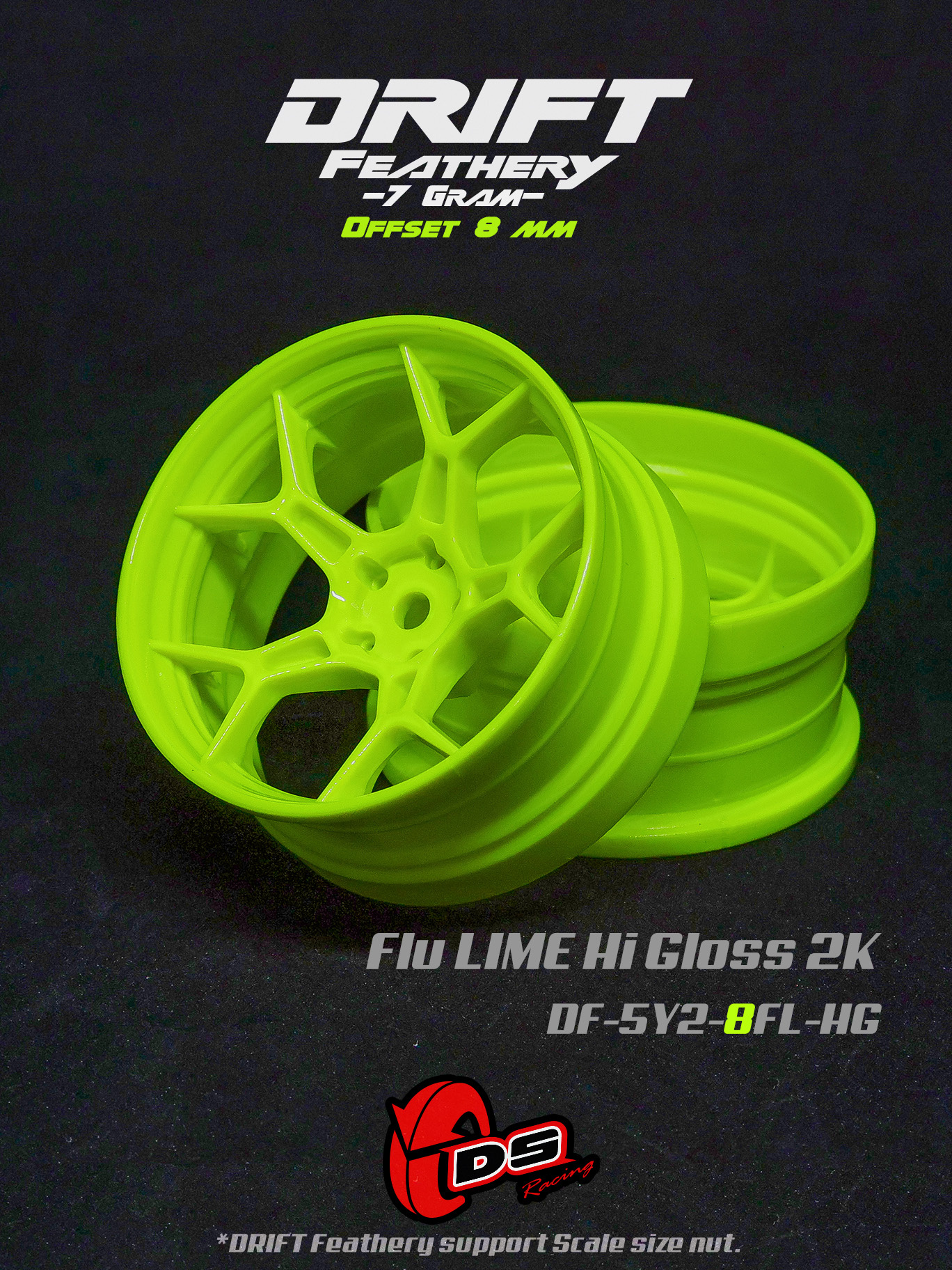 DS Racing / DF-5Y2-8FL-HG / Drift Feathery 5Y Spoke Wheel (2pcs) / Flu Lime Hi Gloss 2K / +8mm offset